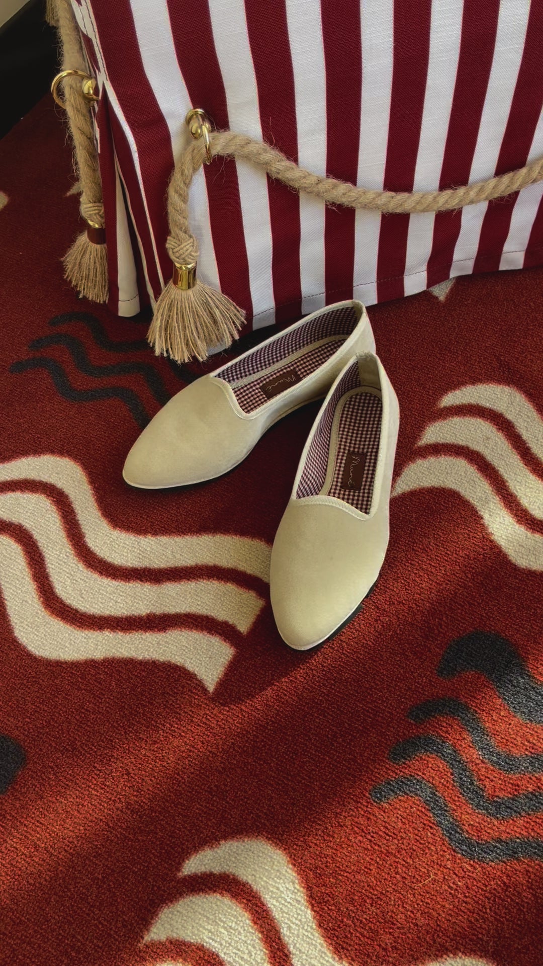 Slipper realizado en resistente terciopelo lavable de alta calidad color marfil y ribete al tono. Su interior está forrado con tejido de algodón a cuadritos vichy, incorporan planta de látex con la que se consigue una pisada ultra confortable. Este terciopelo es perfectamente lavable lavable.
