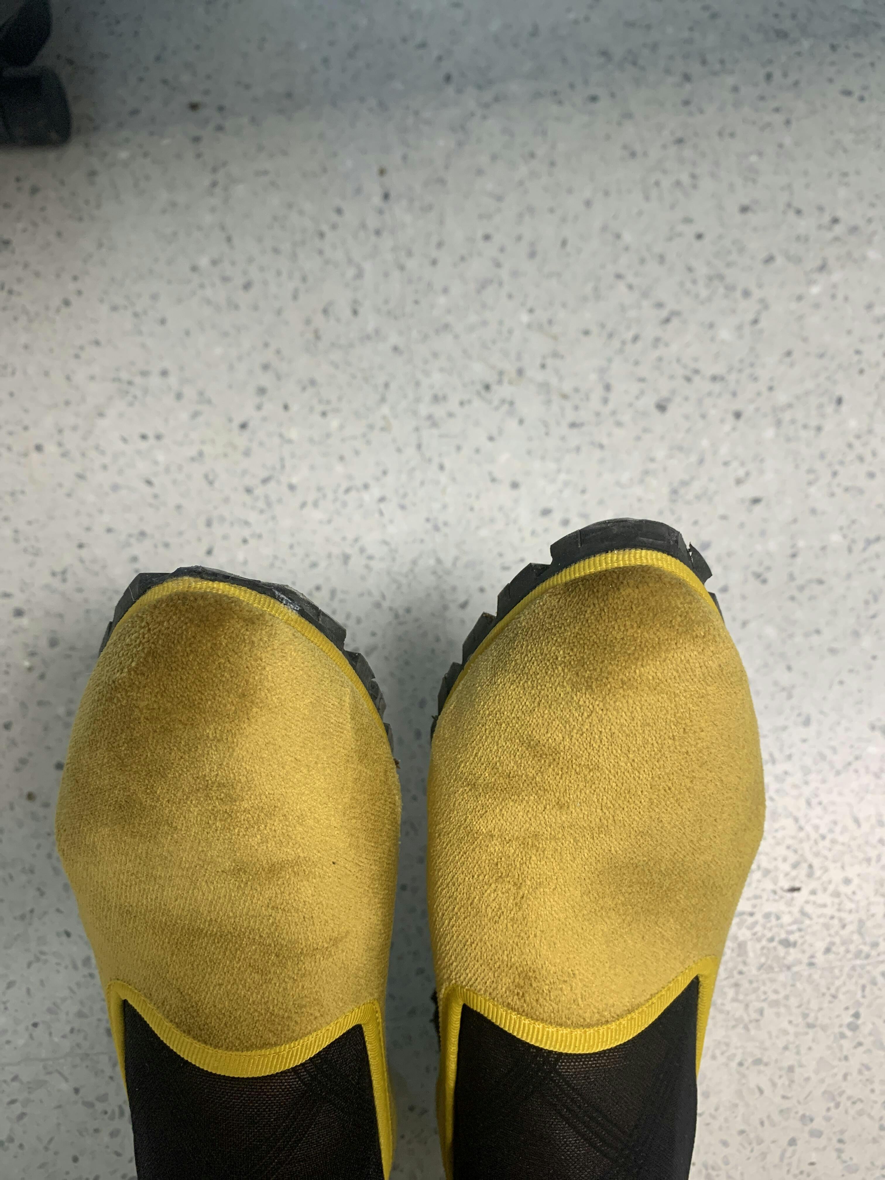 4.- Deje secar al aire libre, esto es muy importante, no utilice ningún tipo de calor sobre la mancha. Para su mantenimiento es recomendable guardarlos con algún soporte interior, como papel, que mantenga el tejido estirado. Evitar almacenarlos dispuestos uno sobre el otro o tocando las suelas el terciopelo.